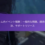 ゲーム内イベントの報酬は、プレイヤーにとって報酬の未受領、技術的な不具合、資格に関する誤解など、さまざまな課題を引き起こすことがあります。特定の問題を特定し、体系的なトラブルシューティングアプローチに従うことで、プレイヤーはこれらの問題を効果的に解決できます。さらに、公式カスタマーサポート、コミュニティフォーラム、ソーシャルメディアチャンネルなどのサポートリソースが、報酬の請求や他のプレイヤーとの接続を支援するために利用可能です。 ゲーム内イベントの報酬に関する一般的な問題は何ですか? ゲーム内イベントの報酬は、プレイヤーが直面するさまざまな課題を提示することがあります。一般的な問題には、報酬の未受領、請求プロセス中の技術的な不具合、資格に関する誤解、請求の遅延、アカウントリンクの問題が含まれます。これらの問題を理解することで、プレイヤーは効果的に対処し、解決することができます。 イベント完了後の報酬の未受領 プレイヤーは、ゲーム内イベントを完了した後に報酬が未受領であると報告することがよくあります。これは、サーバーの問題や報酬配布システムの障害によって発生することがあります。報酬が未受領であると仮定する前に、すべての要件が満たされているかどうかを確認するために、イベントのルールを確認することが重要です。 報酬が受け取れない場合、プレイヤーはまず自分のアカウントの状態とイベントへの参加状況を確認する必要があります。時には、報酬が波状に配布されるため、少しの遅延が予想されることがあります。問題が解決しない場合は、関連する詳細を持ってサポートに連絡することで、解決を早めることができます。 報酬請求中の技術的な不具合 技術的な不具合は、報酬の請求を妨げ、フラストレーションを引き起こすことがあります。一般的な問題には、エラーメッセージ、クラッシュ、または反応しないインターフェースが含まれます。これらの問題は、多くのプレイヤーが同時に報酬を請求しようとするピーク時に発生することがよくあります。 これらの不具合を軽減するために、プレイヤーはゲームクライアントが最新であることを確認し、問題が発生した場合はアプリケーションを再起動する必要があります。キャッシュをクリアしたり、ゲームを再インストールすることも、持続的な問題を解決するのに役立ちます。もし不具合が続く場合は、カスタマーサポートに連絡することをお勧めします。 資格基準に関する誤解 ゲーム内報酬の資格基準は時に不明瞭であり、誤解を招くことがあります。プレイヤーは、参加だけで報酬を受け取れると仮定することがありますが、特定の条件、例えばレベル要件や特定のタスクの完了が適用されることがよくあります。 混乱を避けるために、プレイヤーはイベントの発表やガイドラインを注意深く読むべきです。資格について質問がある場合は、コミュニティフォーラムやFAQを確認することで明確さを得ることができます。サポートに関与することも、資格に関する疑問を明確にするのに役立ちます。 請求処理の遅延 報酬の請求は、高いリクエスト数やバックエンド処理の問題により遅延することがあります。プレイヤーは、すべての要件を満たした後でも、報酬がアカウントに表示されるまでに予想以上に時間がかかることがあるかもしれません。 そのような場合、処理時間は異なるため、忍耐が必要です。プレイヤーは、請求を行った日時を記録し、遅延が通常の時間枠を超えた場合はサポートにフォローアップするべきです。関連情報を文書化することで、これらの問題をより効率的に解決するのに役立ちます。 アカウントリンクの問題 アカウントリンクの問題は、特にプレイヤーが複数のプラットフォームでアカウントを持っている場合、報酬の請求を複雑にすることがあります。アカウントが適切にリンクされていない場合、報酬が正しく転送されず、アイテムや通貨が未受領になることがあります。 適切なアカウントリンクを確保するために、プレイヤーはゲームが提供する公式ガイドラインに従うべきです。定期的にアカウント設定を確認することで、不一致を特定するのに役立ちます。問題が発生した場合は、アカウントの詳細を持ってサポートに連絡することで、迅速な解決が促進されます。 ゲーム内イベント報酬の請求に関する問題を解決するにはどうすればよいですか? ゲーム内イベント報酬の請求に関する問題を解決するには、まず、未受領の報酬や不具合など、直面している特定の問題を特定します。体系的なアプローチに従うことで、効果的にトラブルシューティングを行い、受け取る権利のある報酬を確実に受け取ることができます。 未受領の報酬に関するトラブルシューティングのステップバイステップガイド まず、ゲーム内の通知や報酬履歴を確認して、報酬が請求されたかどうかを確認します。時には、